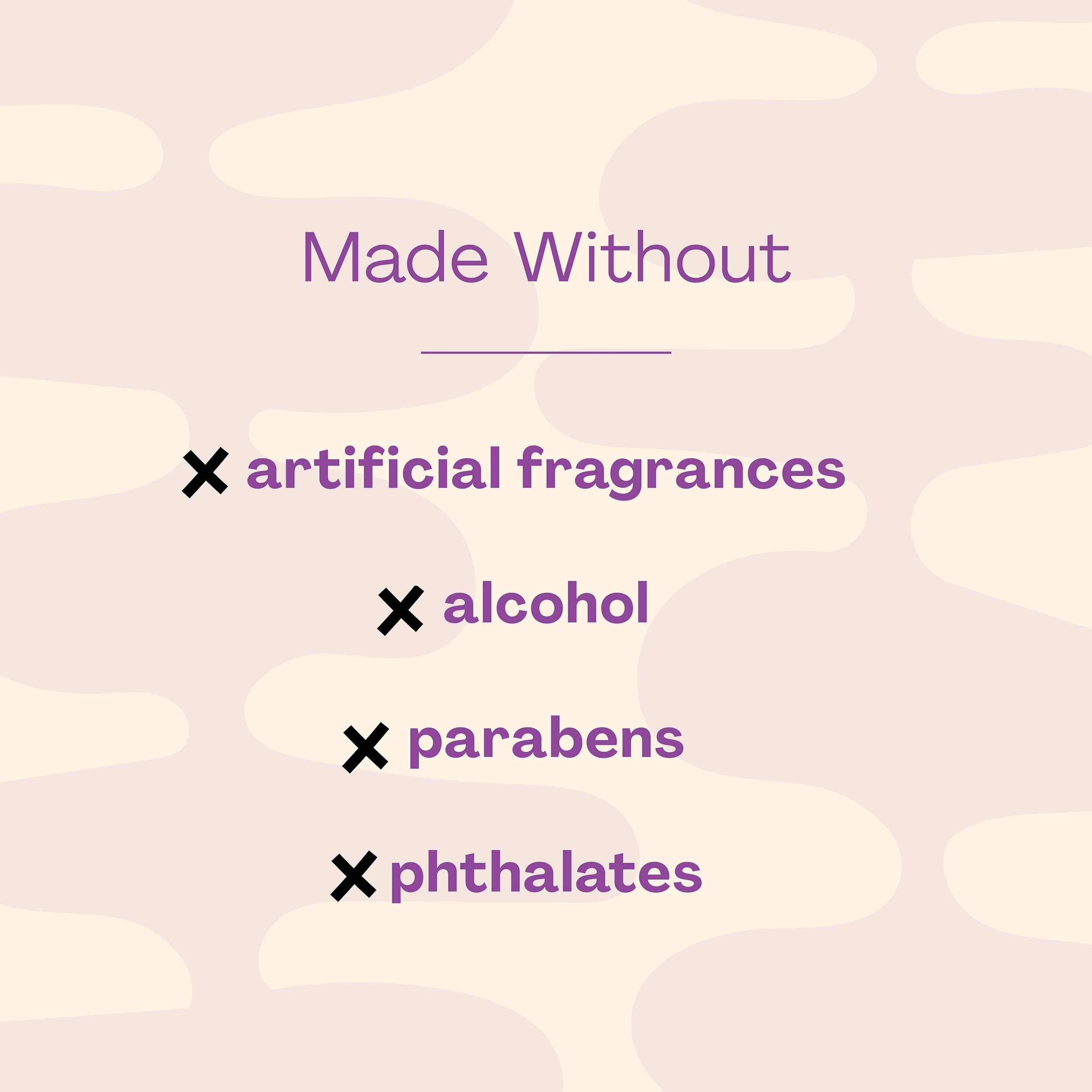 - MADE WITHOUT: parabens, alcohol, synthetic fragrance...basically, it's made with the good stuff.